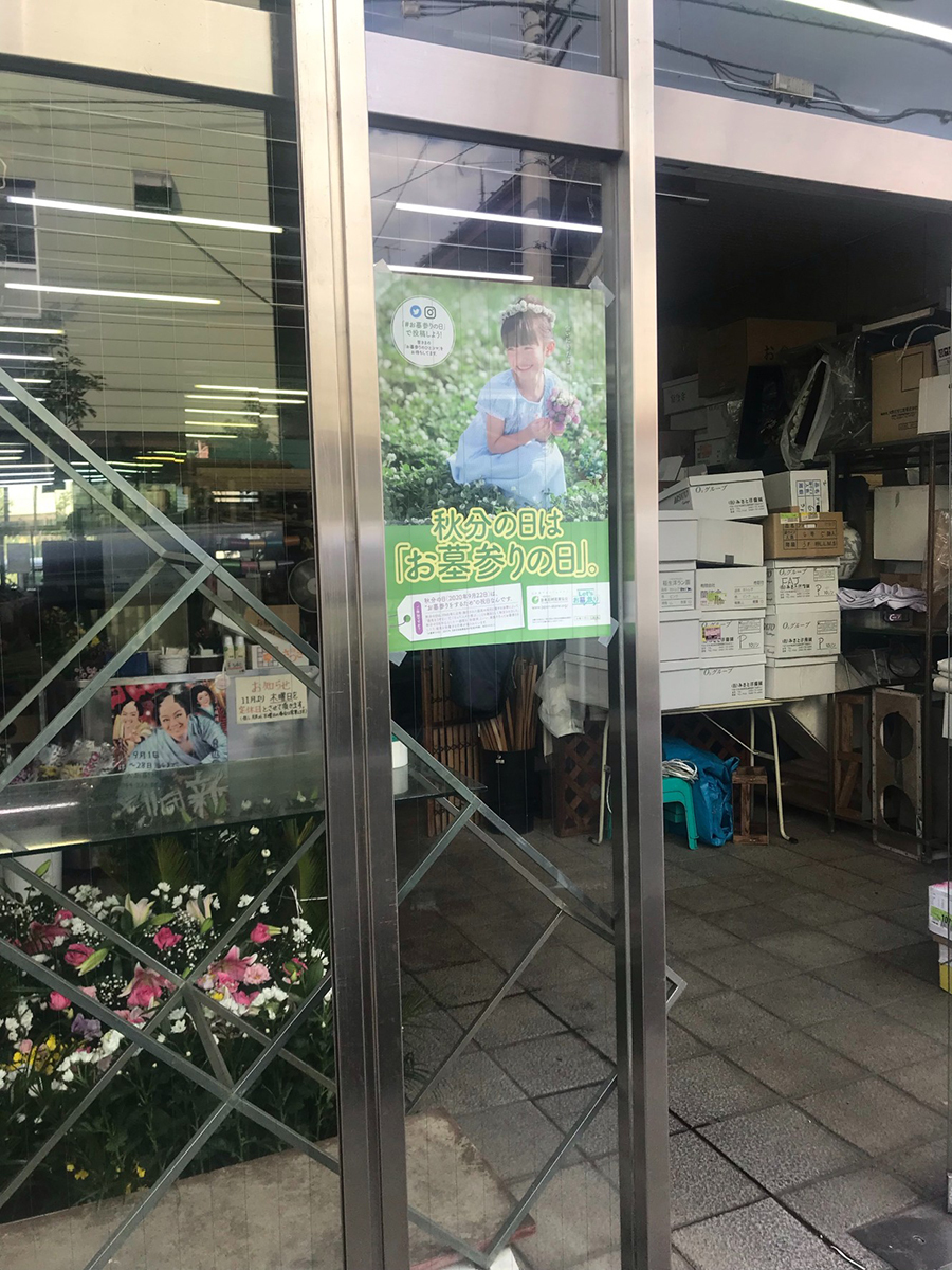 協会作成の「秋分の日はお墓参りの日」ポスターを公共の様々な場所(店舗・学校・寺院